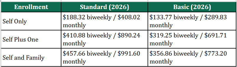 Blue Cross Service Benefit Plan Basic vs Standard Premium(2026). Figures from OPM brochure 71-005 (2026), Nationwide rates—opm.gov.