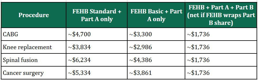 Part A + B column: mainly the Part A deductible in these examples if secondary FEHB covers Medicare’s remaining patient responsibility on covered services. Outpatient-only procedures, multiple surgeons, non-covered services, or different networks would change results.