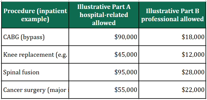 We use these four procedures (not a hospital quote) as examples: CABG (bypass), Knee replacement (e.g. TKA), Spinal fusion and Cancer surgery (major inpatient). We show how Part A and Part B amounts split and how FEHB Standard vs Basic and Part A-only vs. A+B change who pays what—intuition for premiums vs. a big one-time bill, not a replacement for your EOB.