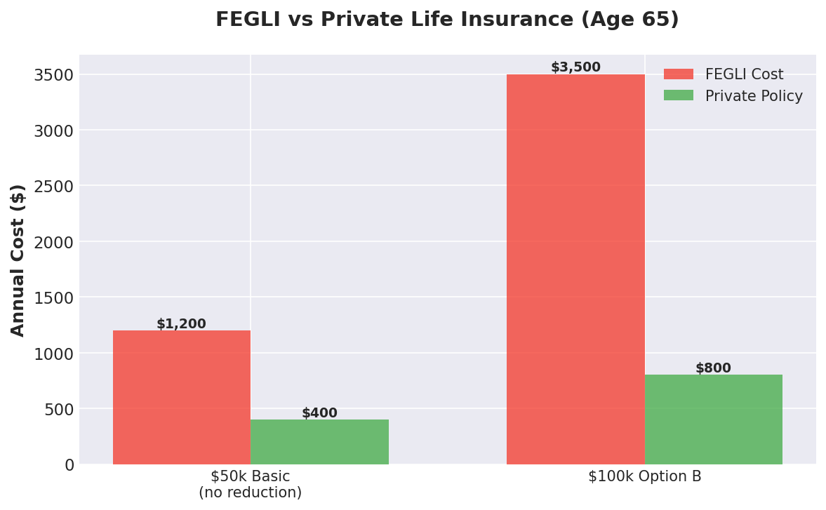 Check this out: if you're 65 and keeping $50,000 in Basic FEGLI without the reduction option, you might be paying $1,200 a year. You could get a private term policy for $400. Over 20 years, that's $16,000 down the drain. And if you're carrying Option B coverage? You could be wasting $54,000 or more.