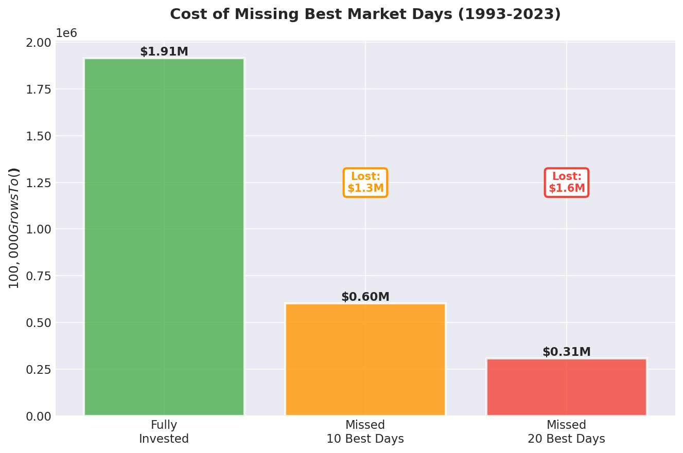 Here's what actually happens when you try to time the market: you miss the best days. And missing just a few of the best days absolutely destroys your returns.