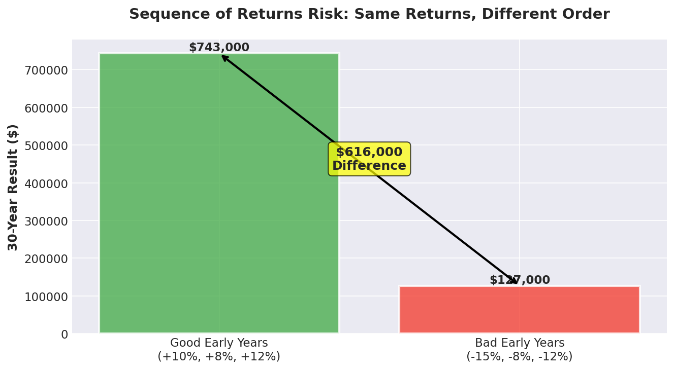Same average returns. Same portfolio. Person A ends up with $743,000. Person B ends up with $127,000. That's a $616,000 difference just because of when the bad years happened.