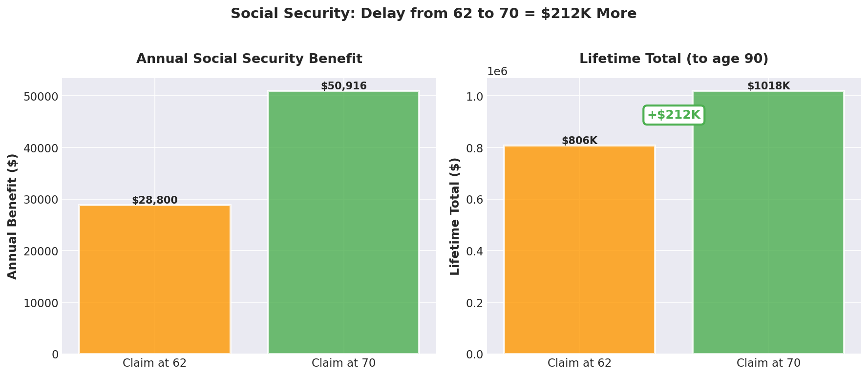 Waiting from 62 to 70 puts an extra $211,920 in your pocket if you live to 90.